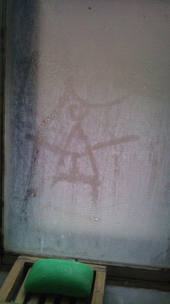 I got up from a feverish haze to the kitchen and as I passed this caught my eye in the bathroom window. Drawn by my son this morning while singing in the bathroom.