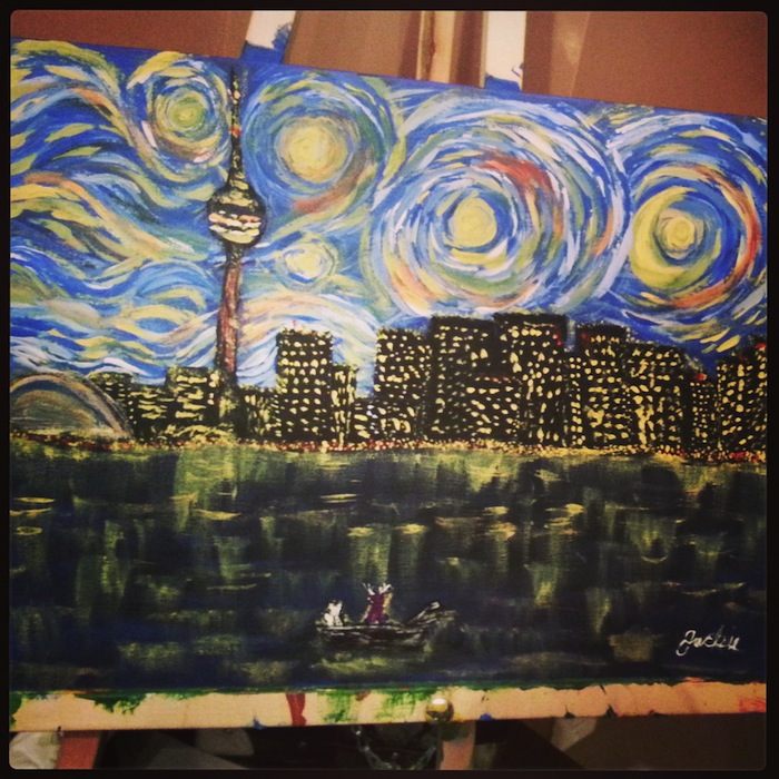 5. And lastly, with what I’m painting this week: I have an art exhibit that is coming up in April (https://www.facebook.com/events/481645721891273/) and I’ve decided to do some paintings to include with the illustrations I’m putting up. For the paintings I had previously decided to place my characters, Charlie and Crush, in different parts of Toronto. Now they’re in my own versions of a few of my favourite paintings.