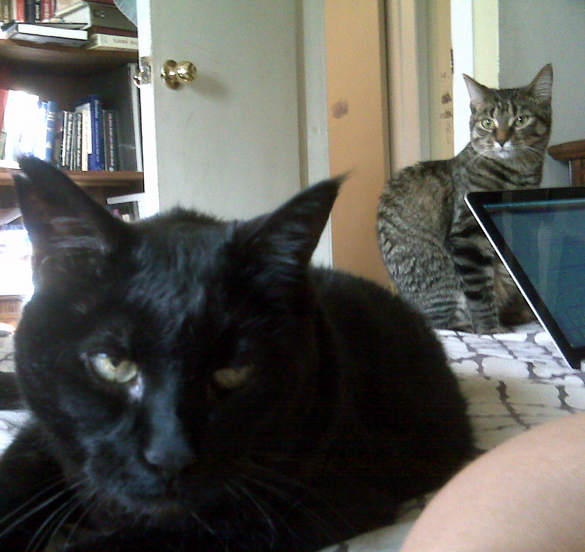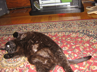 Asha used to be an outdoor cat. A friend, Verona (http://codebloo.net/verona/) does a lot to help out animals (she currently helps find homes for abandoned dogs in Los Angeles), found Asha and passed her onto Heather. So she’s very much a rescue cat, but a very laid back one. Asha has street smarts. We used to live in the apartment on top of Big Sushi in The Annex. We never had an issue with pests because Asha was a diligent guard cat. One night though, she had no idea what to do with her treasure so she dumped a mouse beside me in bed as I slept. I woke up and found a terrified mouse hiding under my pillow. I screamed. Asha looked at me from the foot of the bed like I was some sort of traitor. “How dare you hide the enemy!”