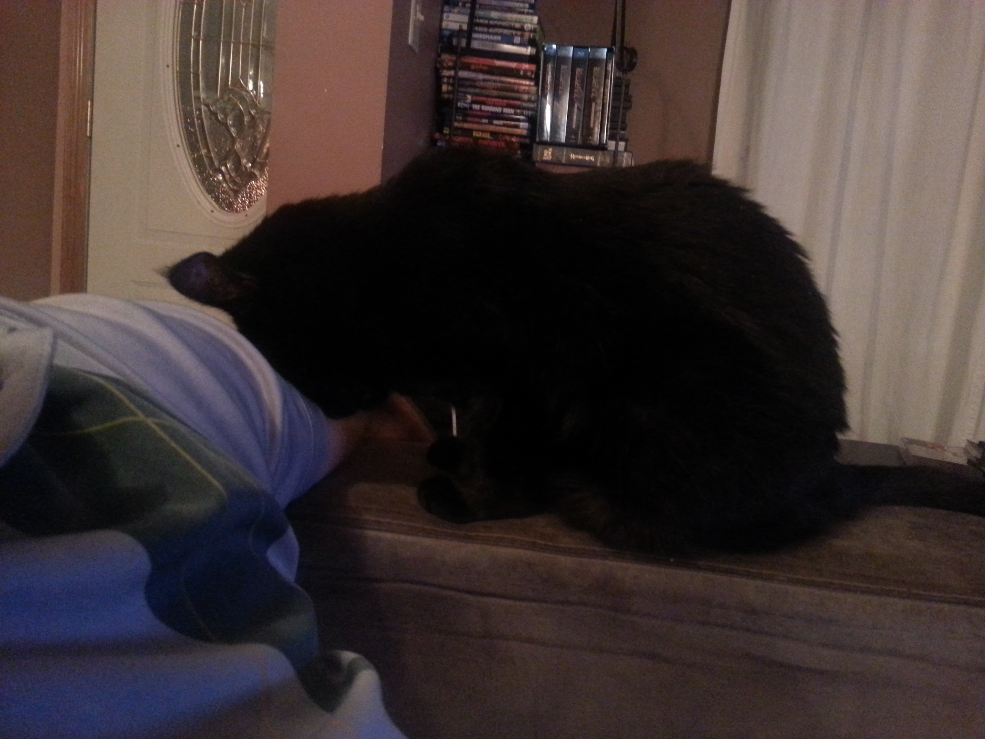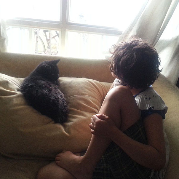 Like most cats, Asha hid under a bed for two days before coming out to explore her new home. For the first few weeks she’d stay at the doorway of the living room and look like Batman overseeing Gothman. I’d pass by her, give her pets, and call her The Dark Night. Then after a bit, she got used to the chaos of the kids. She’d get bolder and sit beside us as we hunkered in for a night of tv watching and book reading. She wouldn’t sit in our laps, but she’d sit at the top of the sofa or sleep on the carpet. Her favorite time was bedtime. I’d tuck the kids in and head back to the living room. Asha would meander over to the kids’ room and look in on them, kind of trying to make sure they were asleep. When she was sure, she’d start turbo-ing around the house, up and down the stairs. Since she was a bit of an overweight kitty, all you’d see was this fat black fur-ball slowly try to speed through the house. It was a hilarious sight to behold.