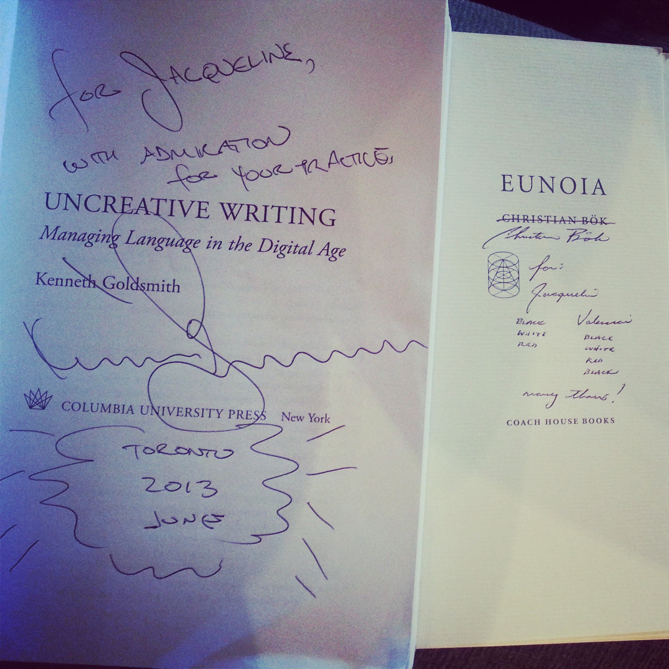 Earlier this week I had the privilege of attending an uncreative writing workshop by Kenneth Goldsmith at The Power Plant in Toronto. He invited me to speak about Getting Inside James Joyce’s Head and some of the other projects that have spawned off of it. It was an enlightening experience and I’m forever grateful to Mr. Goldsmith and Christian Bök for letting me pick their brains. Anyways, in the workshop we used Against Expression and in it I found Georges Perec’s Attempt At An Inventory Of The Liquid And Solid Foodstuffs Ingurgitated By Me In The Course Of The Year Nineteen Hundred and Seventy Four. I read somewhere about it, but I suddenly had it in front me (I had to immediately order a hardcopy of it even though we were given it in class.). Perec does exactly that, writes down what he ate and drank for that year. Now there’s really no way to be sure about the veracity of his log book, but either way, there’s a bunch of hoarded information in there. It’s not unlike what we do with Facebook, Instagram (with pictures and videos), and on Twitter. Most of the updates I see or post myself, are of what we do each day or what we ate or who we saw. Imagine if you had all that information and could compile it in hardcopy form. It becomes a book, an odd narrative of what you did or what you ate or who you saw. You could flip through pages of this stuff, or even just read it online to scroll, copy and paste and distribute at your convenience. It’s a compilation of a journey of everything you did before you got to this moment in your finite life.