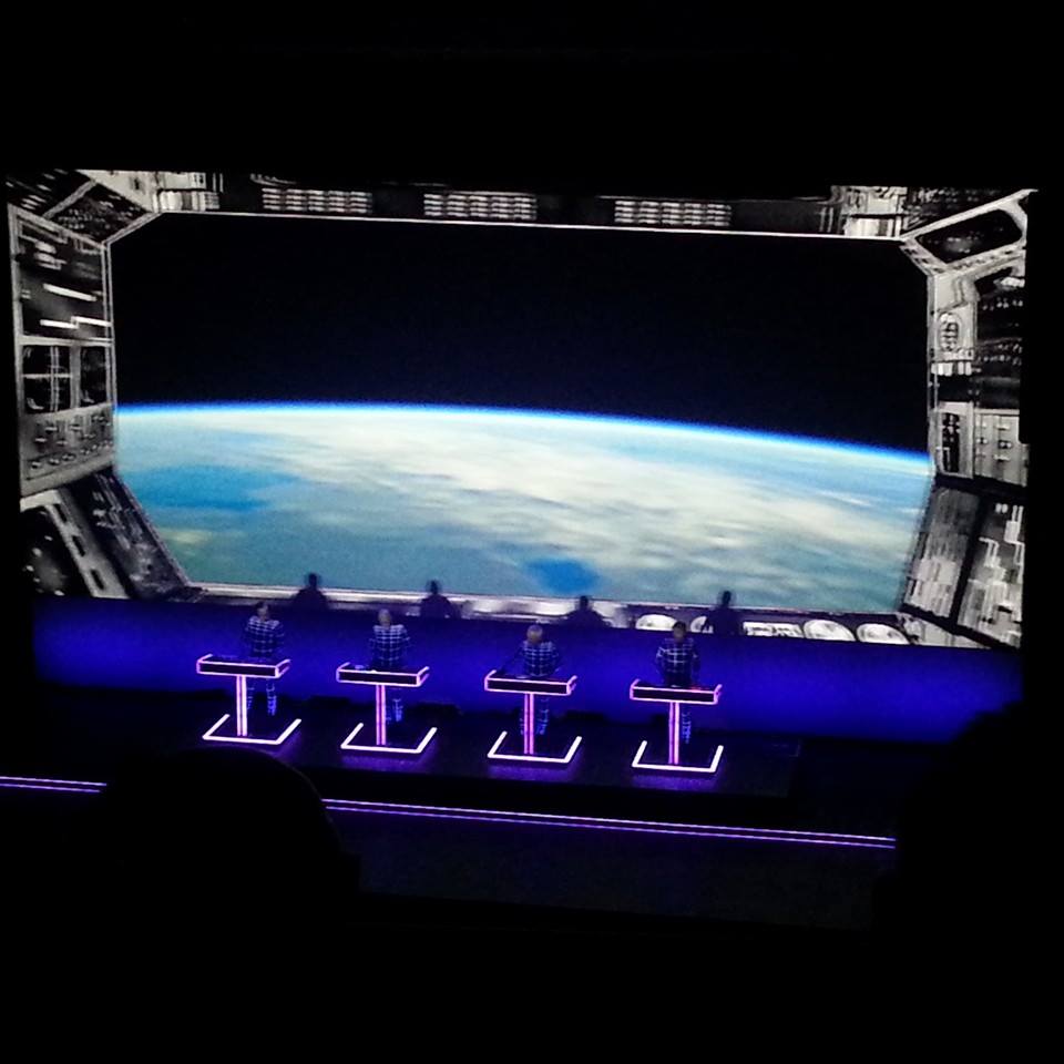 Consecutively playing song after song from their last eight albums, Kraftwerk travelled through their back catalogue highlighting popular themes. With “Numbers,” the screen spat out endless figures over the audience’s heads reminiscent of 1980s desktop images. In “Computer World,” an old school PC floated by as the crowd roared their nostalgic approval. There was a futuristic melancholy in their choice of images that made the band seem more prescient now in retrospect. “Spacelab” was definitely the highlight of the show. The accompanying projections transformed the venue into a giant spacecraft zooming through the stratosphere, soaring with the UFOs, and finally gently landing by the CN tower, much to the enthusiasm of the crowd. “Das Model” was beautifully executed with kitschy 1950s vintage footage, while “Radioactivity” provided a disturbing spin with a quick reference to the Fukushima disaster. They played an extended version of “Tour de France” from their Vitamin album at the median, which felt more like an ode to Ralf Hütter, who is an avid cyclist. Surprisingly, while “Autobahn” was the crowd favorite it may have been the only weakness in the set. Its long version in performance didn’t provide anything different to its music video version. Nonetheless the synthpop love was clearly felt as Kraftwerk looped through familiar beats and fully took advantage of the crystal clear sound system of the venue.