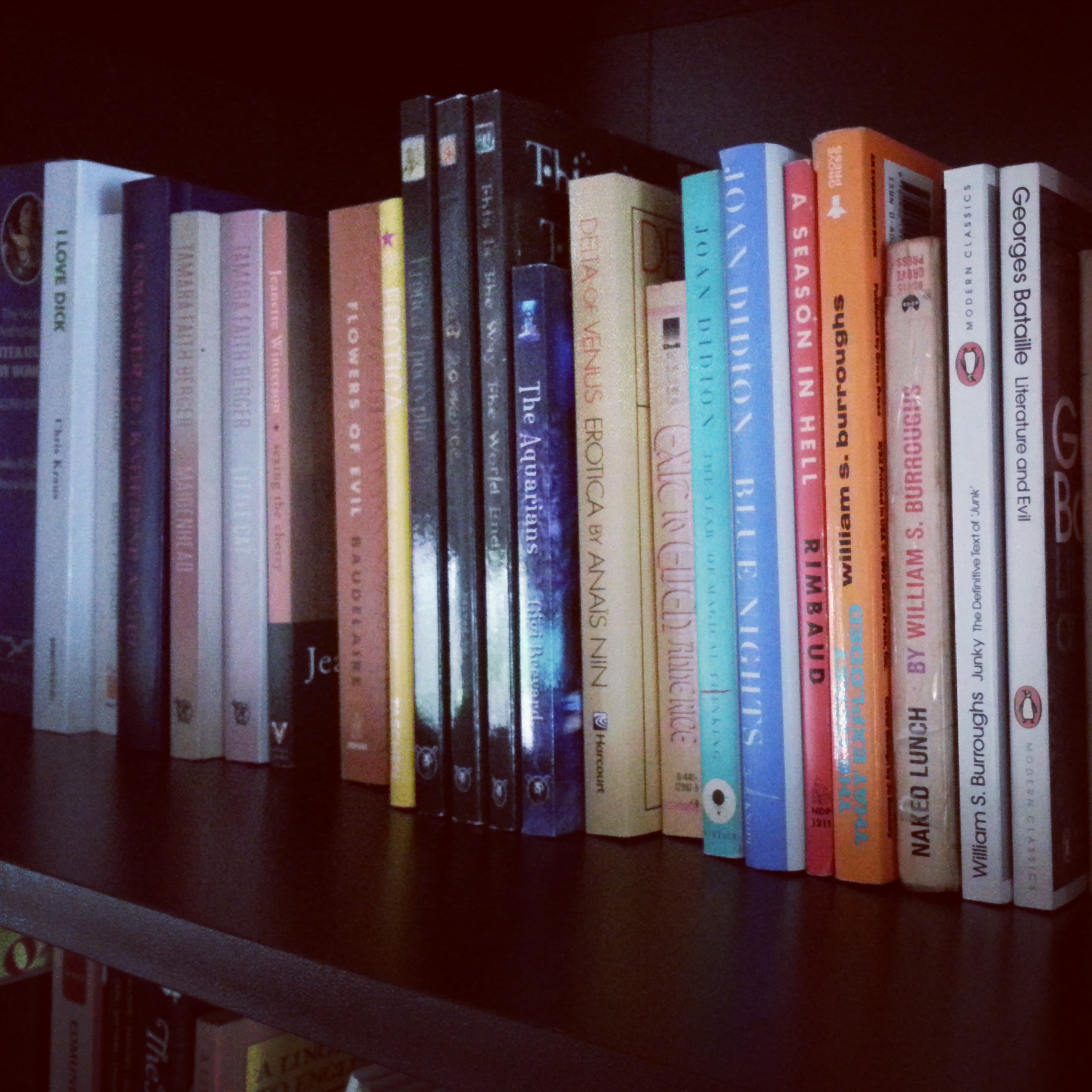 IMG_20140614_082853 (1)I’m a disorganized book lover and my shelves have their own weird system. I’ve somehow mixed my more erotic forms of literature with feminist texts, Freaky Fountain Press books, William S. Burroughs, Samuel R. Delany, poetry, and the Bible. The Bible can be pretty porn-y, no? Sometimes Joyce’s Ulysses finds itself up there too.